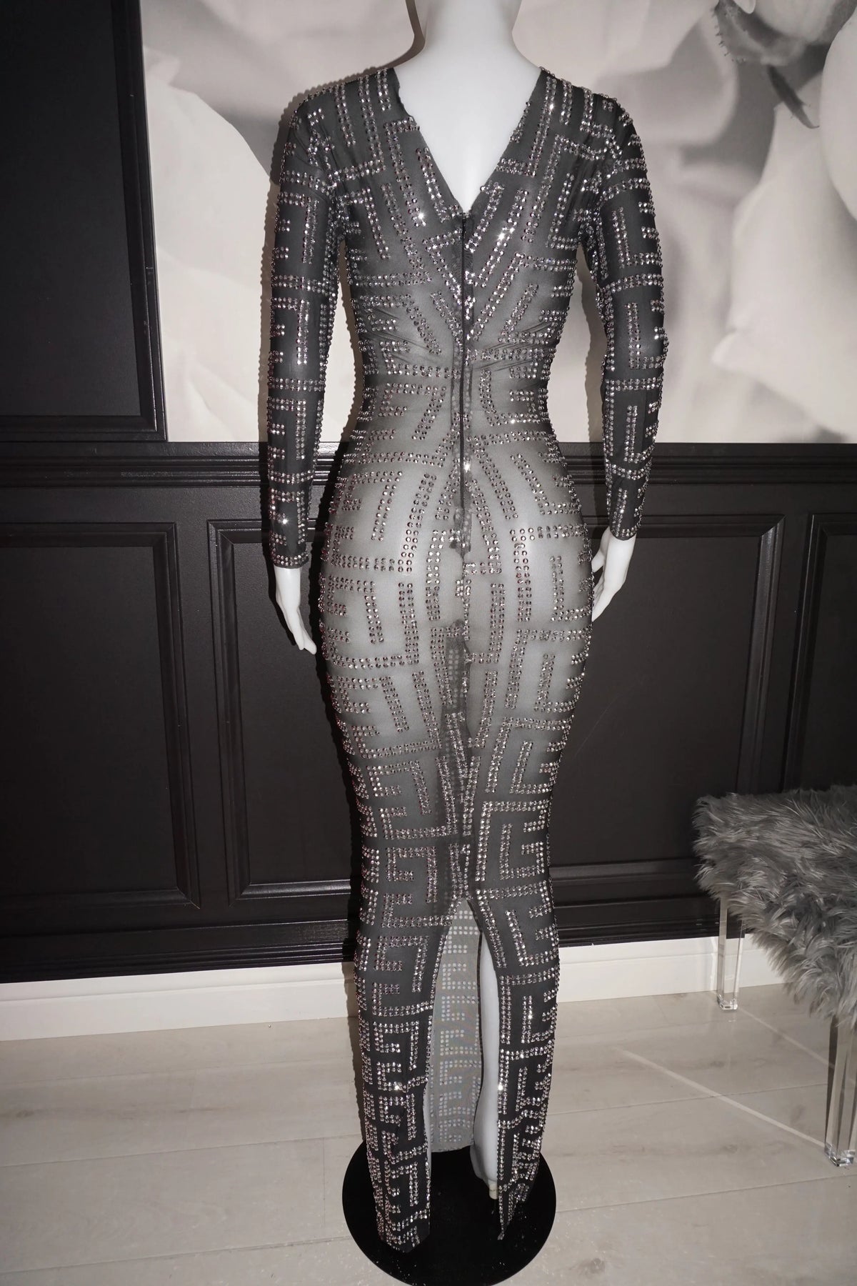 Can't go wrong with this this long maxi long sleeve Black mesh ( see through ) with silver stones. This dress has a V cut in the back with a small slit at the bottom of dress.