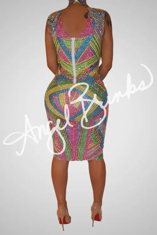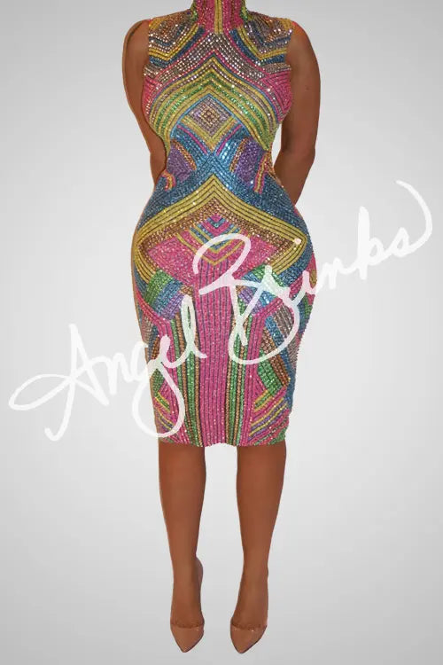 Tastes like candddyyyy! This is a midi length sleeveless dress with a turtleneck covered in colorful rhinestones. Made of our snap-back material for the best curve-hugging fit. The item has some stretch but very minimal. Zipper up the back making it easy to get in and out of. Perfect for lunch with the girls. Pair with a nude pump (as shown on model) or with a strappy heel.