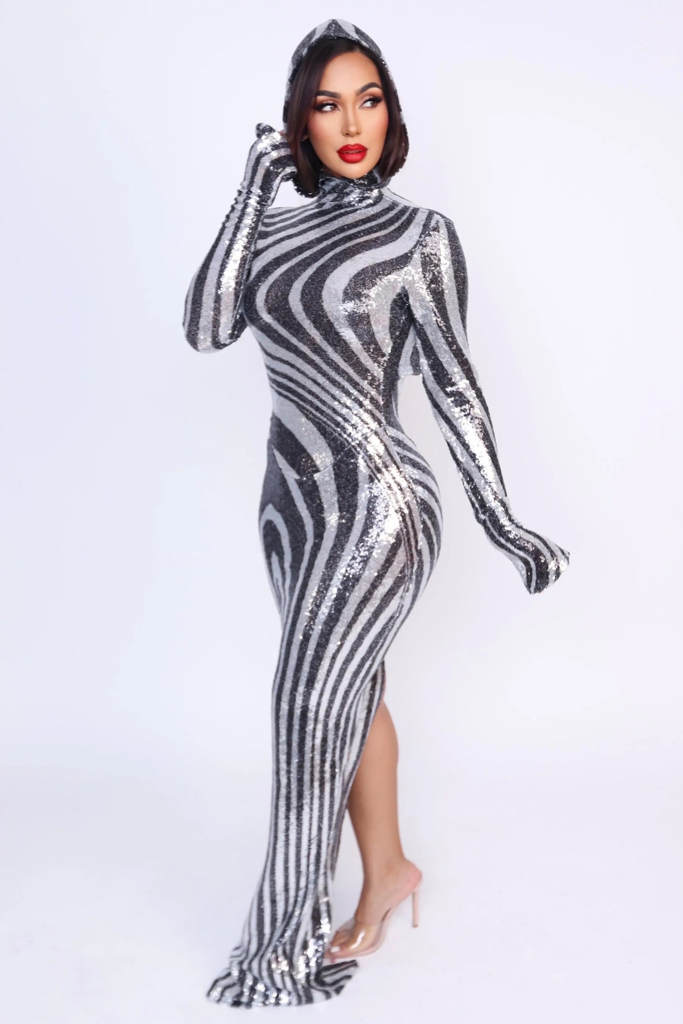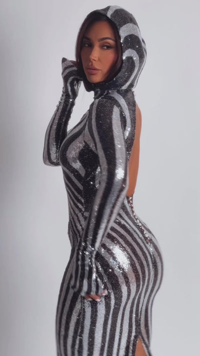 Command attention and exude high-fashion mystique with the Sequined Enigma Hood — a glamorous maxi dress designed for the fearless trendsetter. Its swirling, holographic sequin pattern dances in the light, creating a hypnotic, one-of-a-kind effect that’s pure statement-making magic.