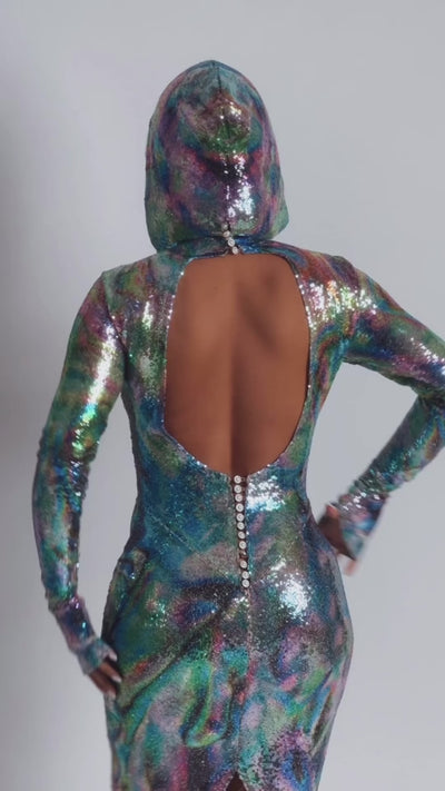 Step into a world of iridescent magic with the Shimmer Cloak — a bold, futuristic maxi dress that merges high-fashion drama with show-stopping sparkle. Designed for those who dare to shine, this gown is an unforgettable blend of sleek sophistication and otherworldly shimmer.