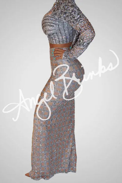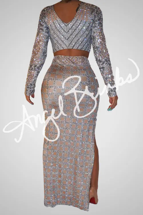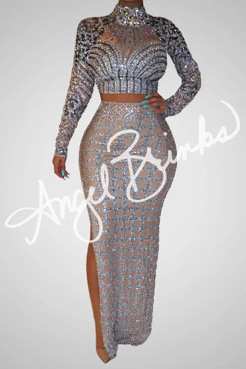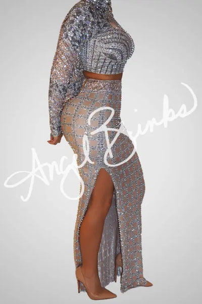 Kim K inspired two piece skirt set. Features nude fabric with silver stones, a slit on the side of the skirt and a long sleeve crop top. Item is stretchy!
