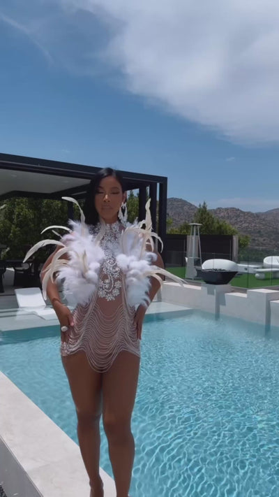 Unleash celestial glamour in “Starplume,” a show-stopping leotard dress that melds ethereal white feather plumes with cascading rhinestone chains. Crafted on a figure-hugging nude mesh base, this piece is designed to catch every light and command attention—perfect for VIP events, stage performances, or any moment you need to shine.