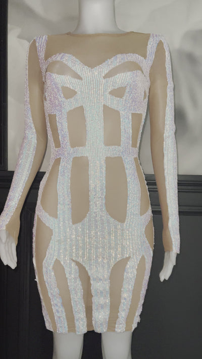 All mesh with white sequenced designed in all the right places on the dress. There is a zipper in the back. It is stretchy.